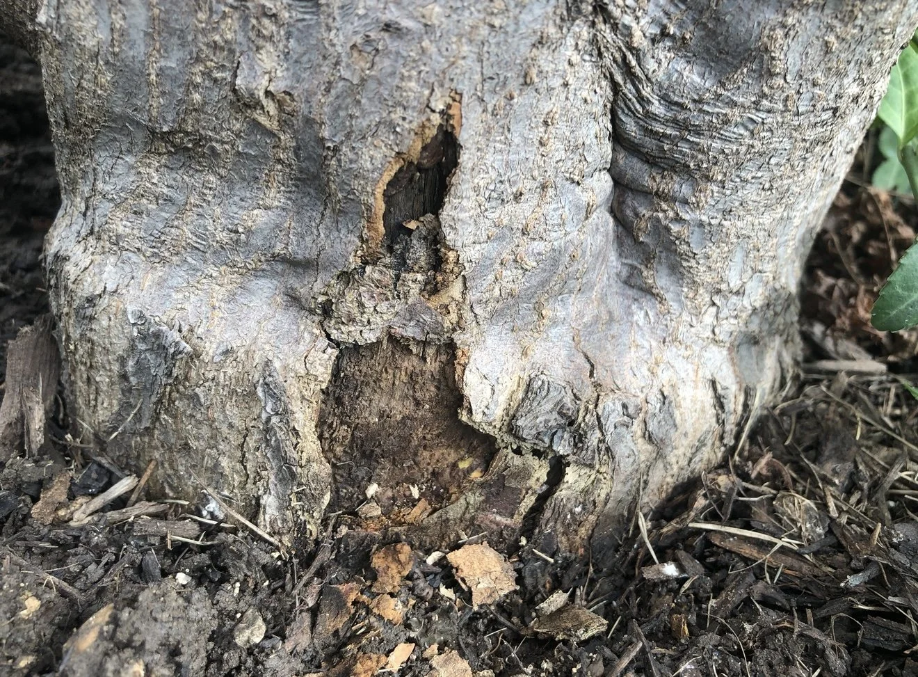 The root flare (where the trunk flares out into roots) is critical to water and nutrient uptake. If weed trimmers, mowers, or trenching have damaged this area, or it is buried under mulch or soil, the tree may have already lost a significant portion of its vascular connection.